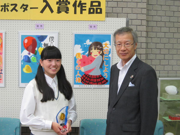 アドバンスコース1年の波多野寿々代さんが、「平成27年度人権に関する児童生徒作品(ポスター)」で優秀賞を受賞しました。 8月29日(土)に開催された人権ふれあいフェスティバルにおいて、藤部山口県副知事から表彰されました。