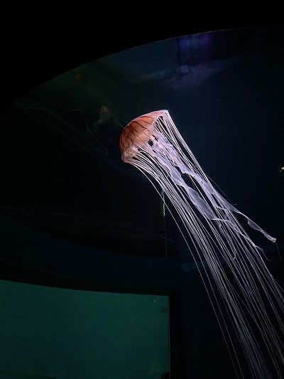 「テイクフォーツ」で各班が撮影した写真を展示し、鑑賞した生徒・教職員に、気に入った作品を選んで投票していただきました。フォトコンテストで表彰された優秀作品は、投票数が多かった上位の作品となります。グランプリに選ばれたのは、タイトルは『海月』で、暗闇に浮かび上がるクラゲを写した2班の写真でした。準グランプリには、かわいらしいペンギンの姿が上手に写し出された、4班の『あ、どうも』が選ばれました。