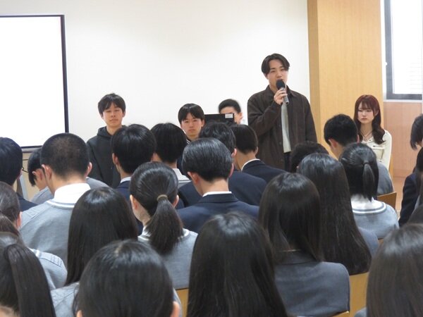 在校生に向けて、それぞれの体験談を交えて、勉強方法のアドバイスやモチベーションの保ち方、総合型選抜や学校推薦型選抜に向けた対策の話などをしてもらいました。在校生も卒業生の話に真剣に耳を傾け、メモを取りながら聞く様子が見られました。