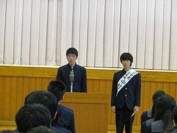 体育館での立会演説会で、立候補者と推薦者がそれぞれ自分の考えや方針を堂々と、とても立派に全校生徒に伝えました。