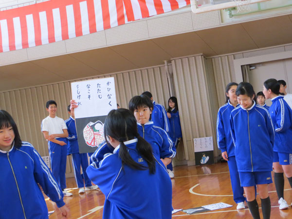 3月11日(水)、百人一首大会を行いました。 大会の事前準備として、美術と国語の授業で、百人一首に必要な大きな取り札を作成しました。取り札を作成する過程で、和歌の意味や仮名遣いの違いについて考える機会を持つことができました。 大会当日は、完成した取り札を体育館に広げ、クラスマッチ形式で行いました。結果は、1年1組の優勝となりました。