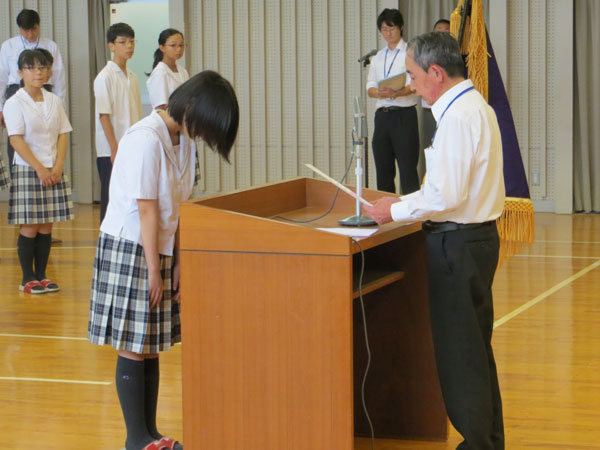 9月1日(火)、中学校の始業式を行いました。 生徒たちは2学期最初ということもあり、気を引き締めて式に臨んでいました。始業式に続いて、各クラスの委員長・副委員長の任命式を行いました。各クラス新しい委員長・副委員長とともに力を合わせ、2学期もがんばってください!