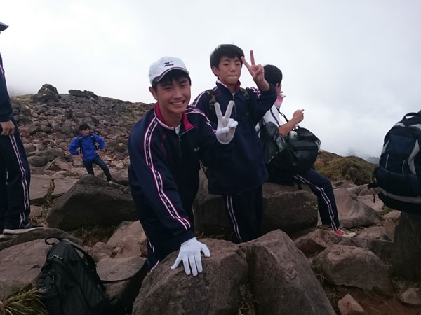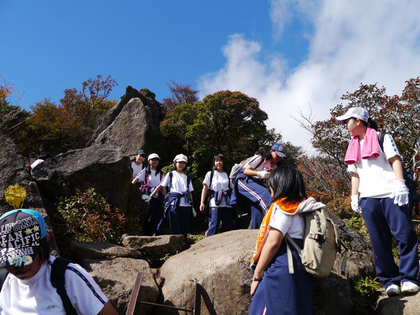 1日目の体験は久住登山、9月上旬並みの暖かい天候に恵まれ、参加したメンバーが一人も欠けることなく山頂にたどり着く事ができました。とても険しい道でしたが、お互いが協力し合いながら登ることができました。