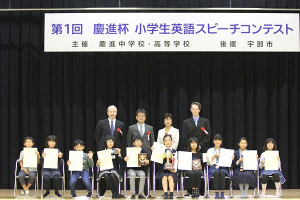10月28日(土)、主催慶進中学校・高等学校、後援宇部市で、25社からの協賛を頂き「第1回慶進杯小学生スピーチコンテスト」を実施しました。 4~6年生の52人の小学生が参加し、素晴らしいスピーチを発表しました。参加したみなさんにとって英語に触れ、大勢の人の前で話すよい機会になったと思います。