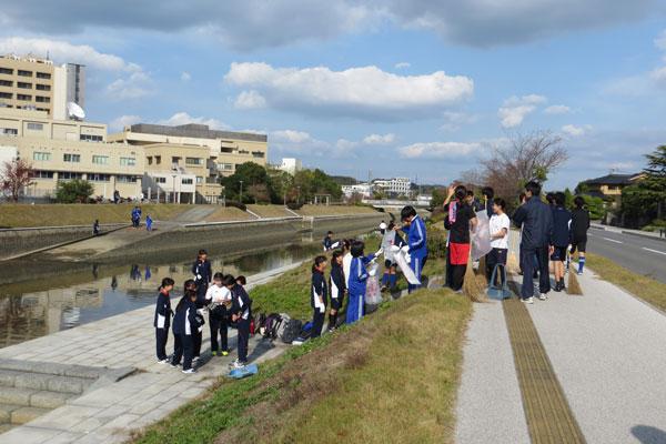 11月17日(土)、中学校生徒会・中央委員会と中学生有志で、真締川周辺の清掃活動を行いました。 総勢83名が参加し、日頃から登下校や部活動の際に利用する道をきれいにしました。11月半ばということで落ち葉が多かったのですが、中には空き缶やペットボトル、たばこの吸い殻などもあり、「この道を利用するすべての人がごみを捨てない意識を持ちたい」と述べる生徒もいました。