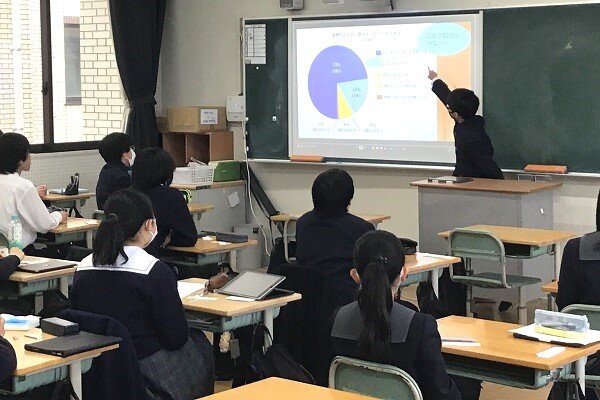 3月15日 (土) 中学校 1・2年生GLP(グローバル・リーダーズ・プログラム)報告会を保護者参観で行いました。両学年をそれぞれ9グループに分けて9会場で、一人ひとりが4分程度でテーマ発表をしました。前半は1年生が門司港レトロ フィールドワークに基づいて見つけたテーマを、後半は2年生が「TED」(世界の研究者の発表の動画)を視聴したものから一つ選んだテーマを10枚程度のスライドにして発表しました。会場ごとに発表者が視聴した人全員から評価シートを受け取り、ICTスキルやプレゼンテーション能力などの資質向上につなげました。
